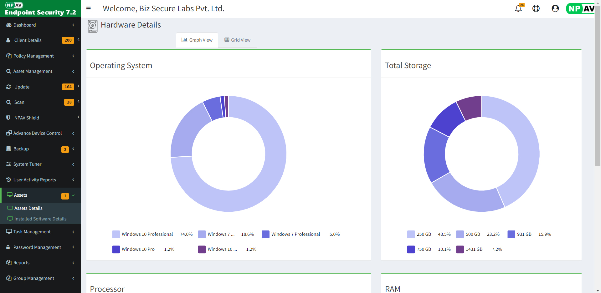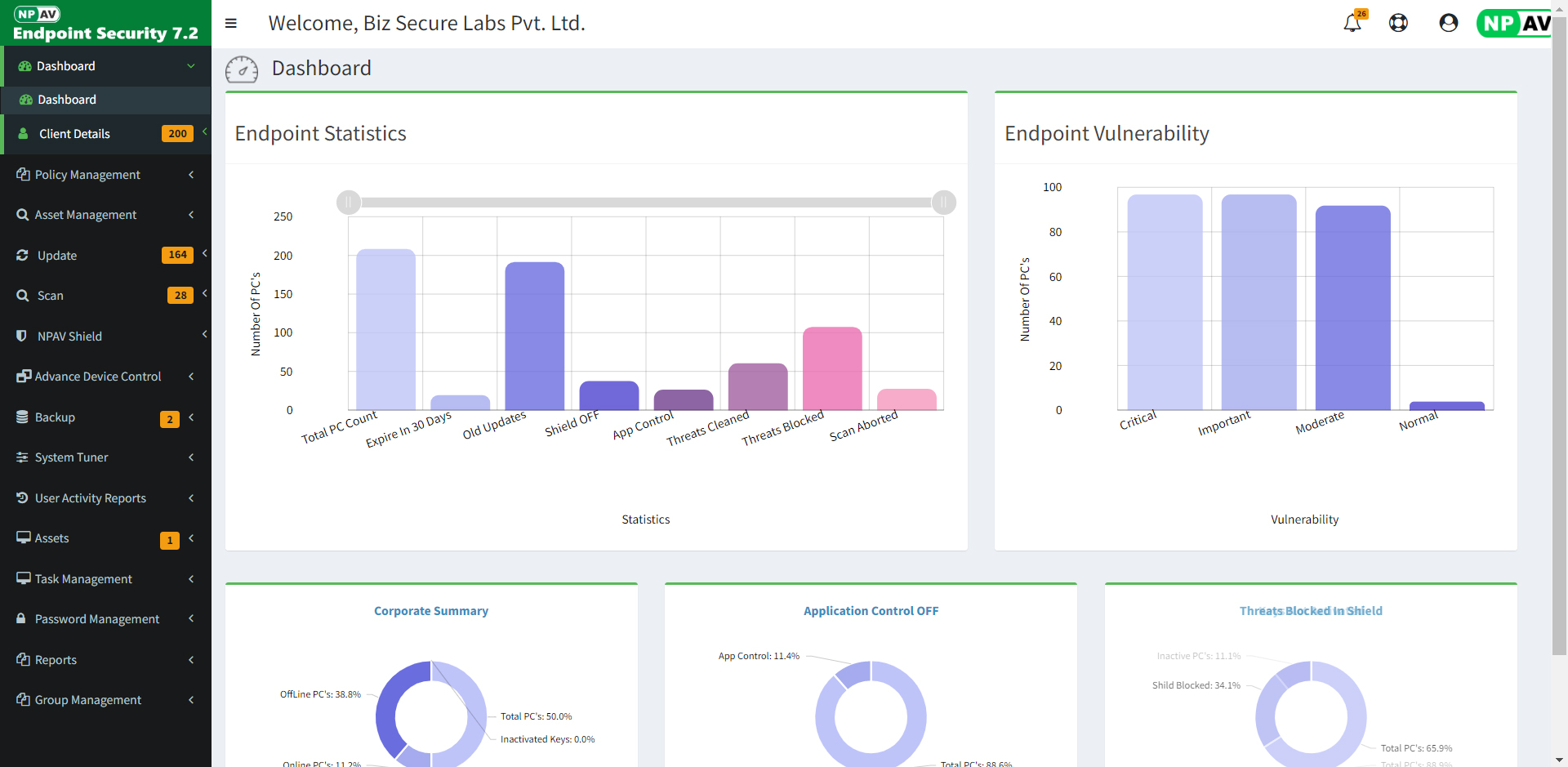 Shows the network security health status, Statistics of client, Updates and threat status across the