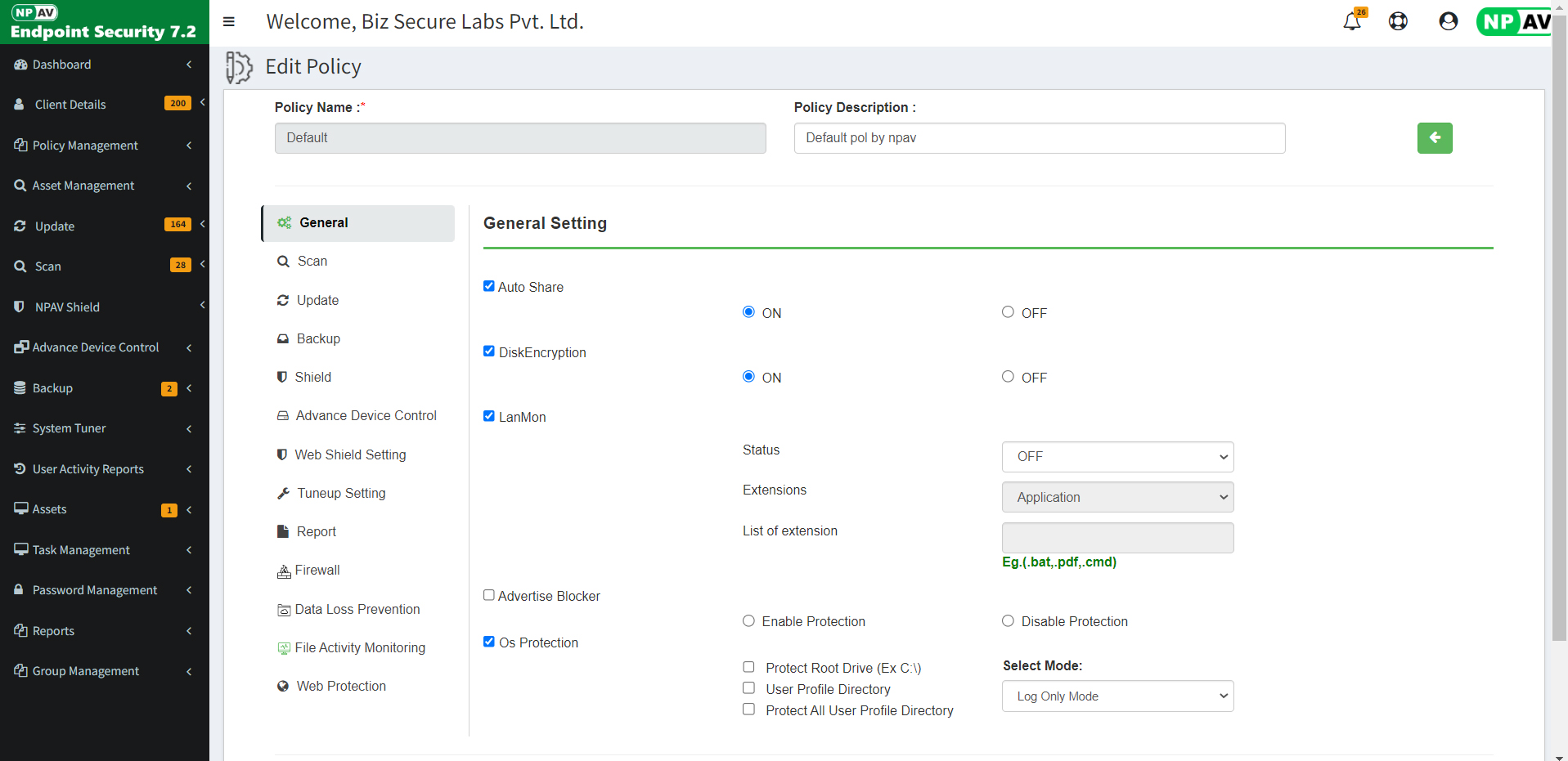 Remotely manage Antivirus Settings and Policies on Single PC or Group.
